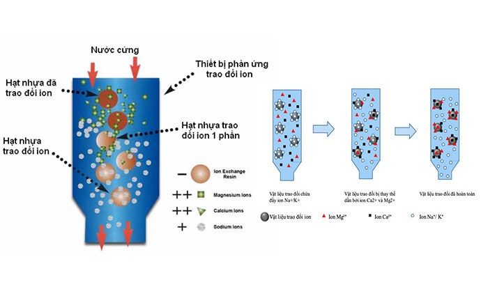 Quá trình lọc nước khử ion sẽ tách bỏ điện tích dương (cation) và các ion mang điện tích âm (anion) ra khỏi nước.